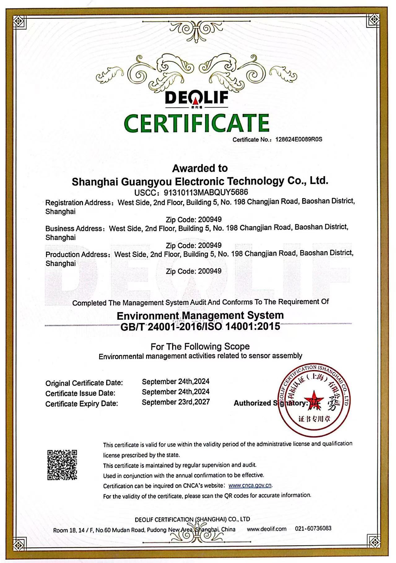 ISO9001环境管理体系认证证书(英文版)